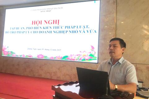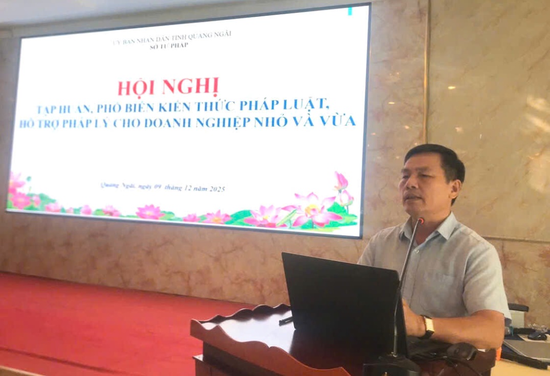 Thực hiện Kế hoạch của UBND, trên cơ sở Kế hoạch về hỗ trợ pháp lý cho doanh nghiệp nhỏ và vừa trên địa bàn tỉnh năm 2025 và Kế hoạch số 28/KH-STP ngày 13/10/2025 của Sở Tư pháp về tổ chức các hoạt động phổ biến kiến thức pháp luật, hỗ trợ pháp lý cho doanh nghiệp nhỏ và vừa trên địa bàn tỉnh. Ngày 09/12/2025 Sở Tư pháp tổ chức Hội nghị phổ biến kiến thức pháp luật và hỗ trợ pháp lý cho DNNVV khu vực phía Tây tỉnh Quảng Ngãi; dự chỉ đạo Hội nghị có ông Vương Văn Tuyên, Phó Giám đốc Sở Tư pháp; cùng các trưởng phòng chuyên môn thuộc Sở Tư pháp; các đại biểu là đại diện cho các DNNVN, Hợp tác xã, đại biểu UBND cấp xã khu vực phía Tây tỉnh Quảng Ngãi tham dự.